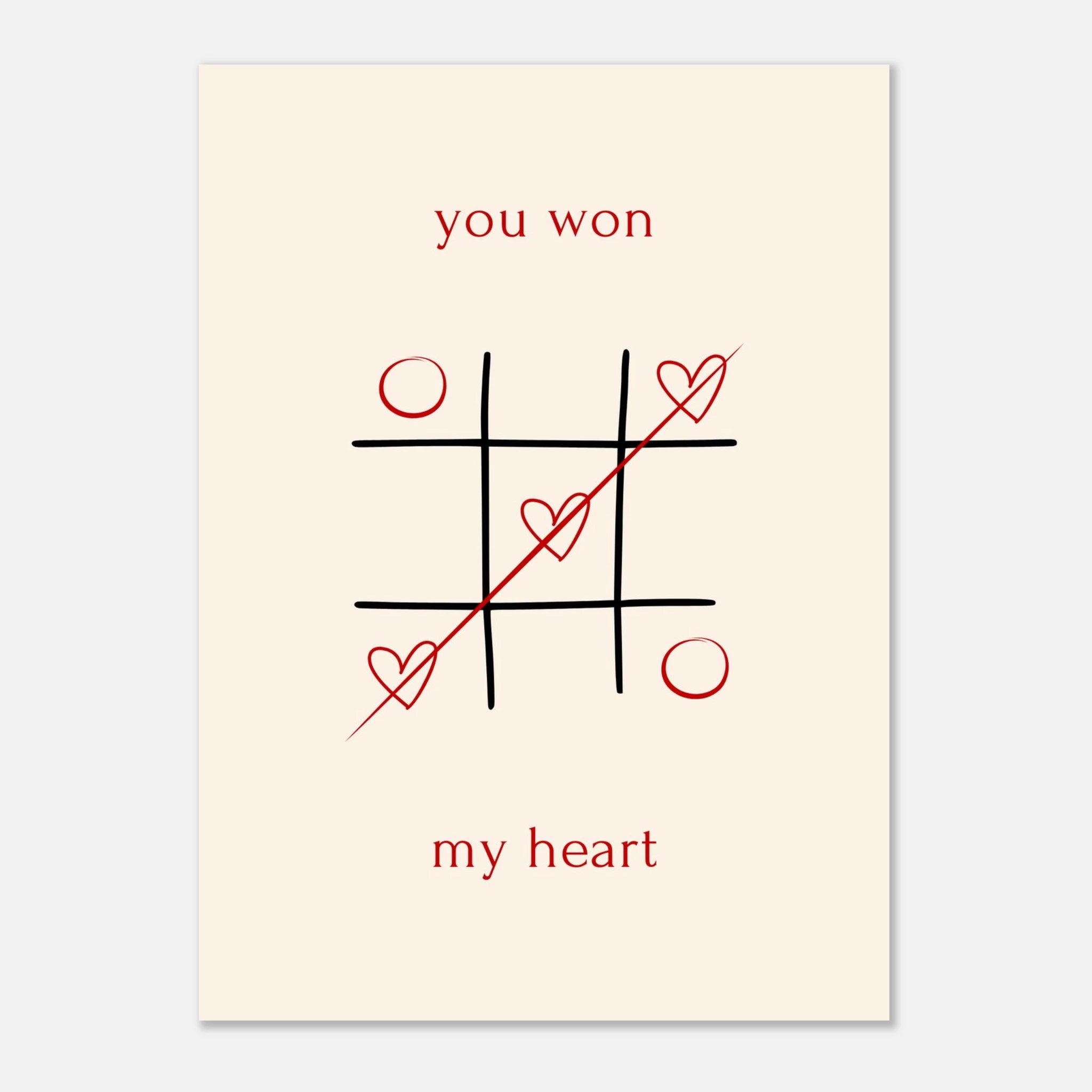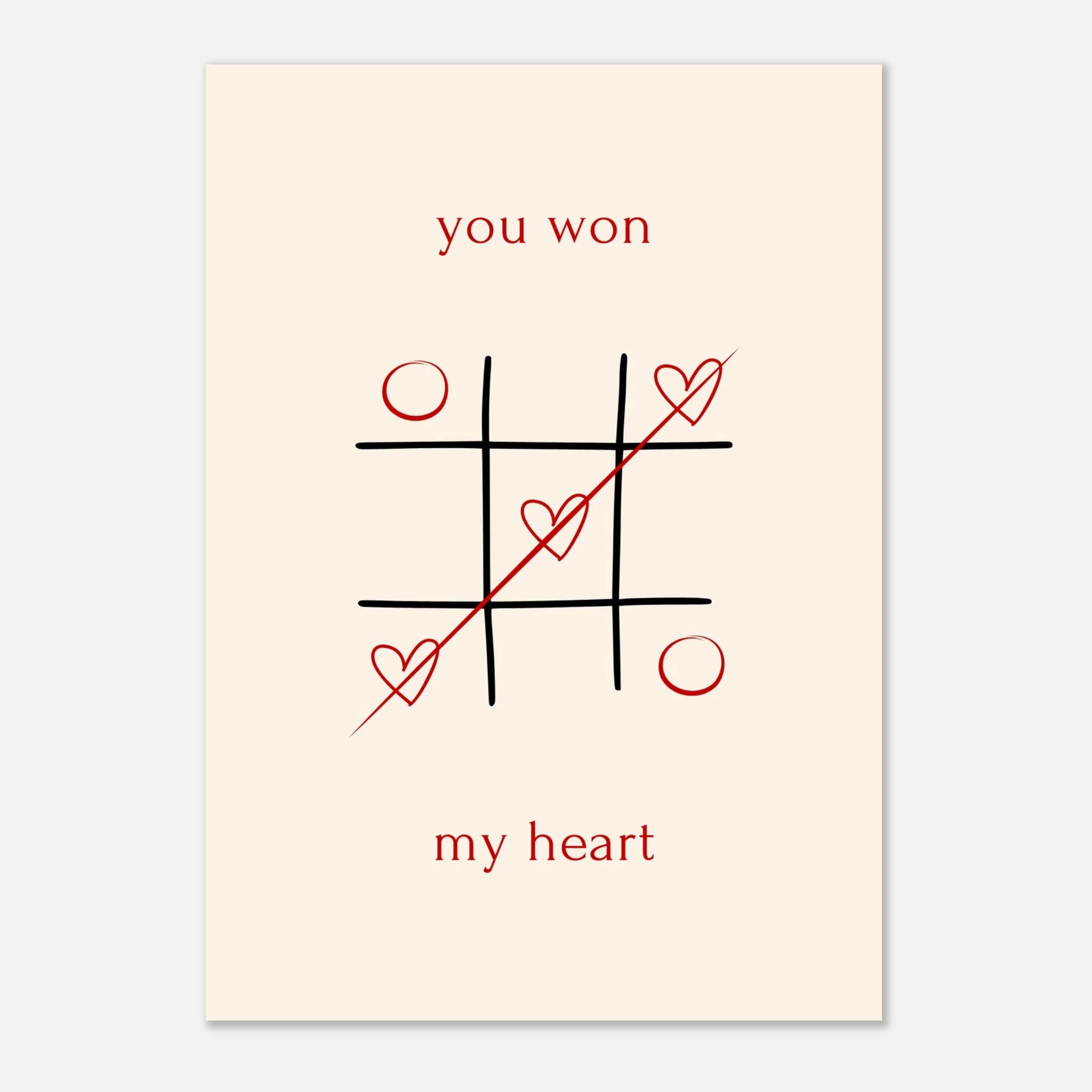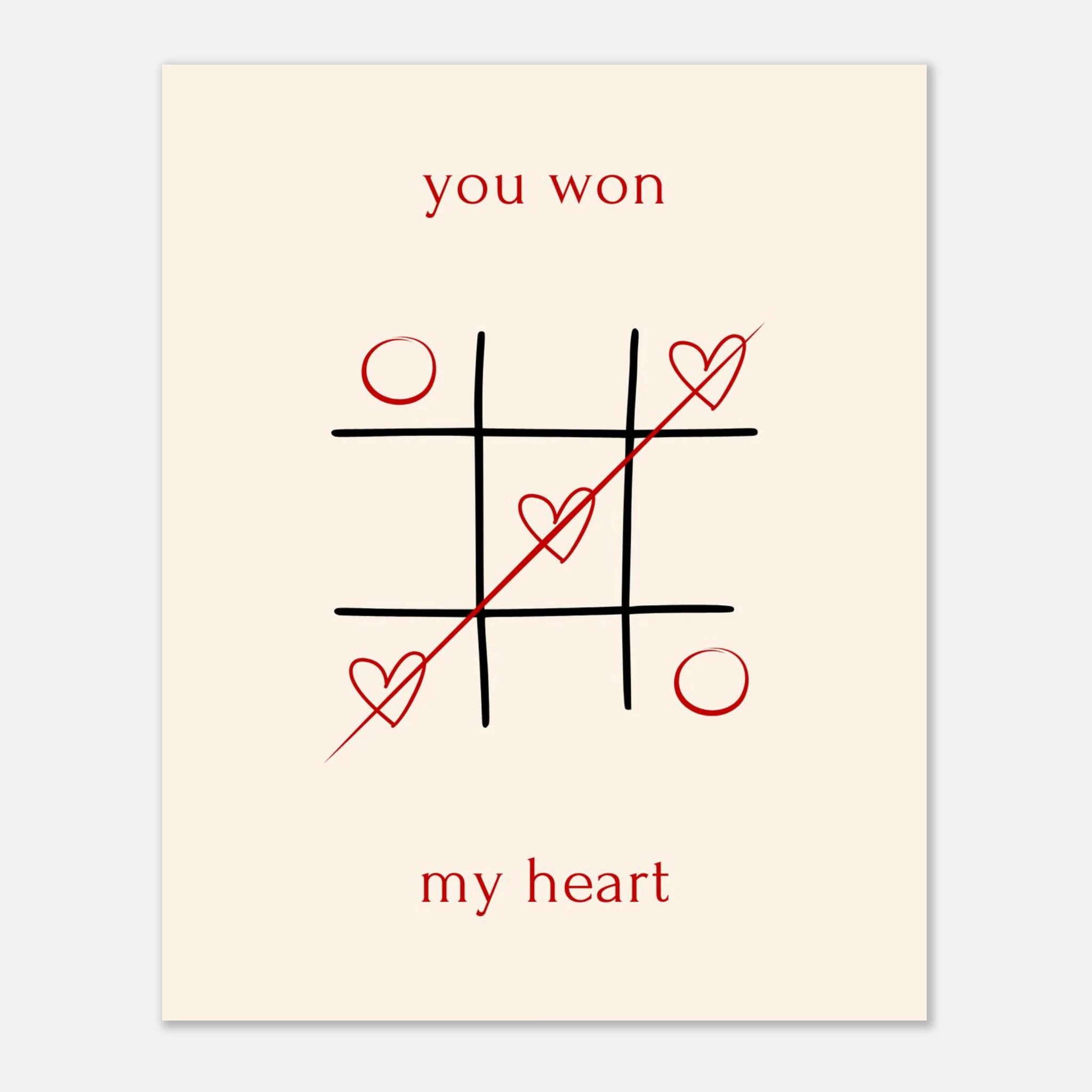 Celebrate your winning love story with our "You Won My Heart" Tic-Tac-Toe poster. This charming design, featuring classic tic-tac-toe with playful hearts and a heartfelt message, is a sweet declaration of affection. Perfect for surprising your significant other, it’s a delightful way to show them they've truly captured your heart. Printed on our premium matte paper, this poster brings a touch of romance and whimsy to any space, making it an ideal gift for anniversaries, Valentine's Day, or just because.