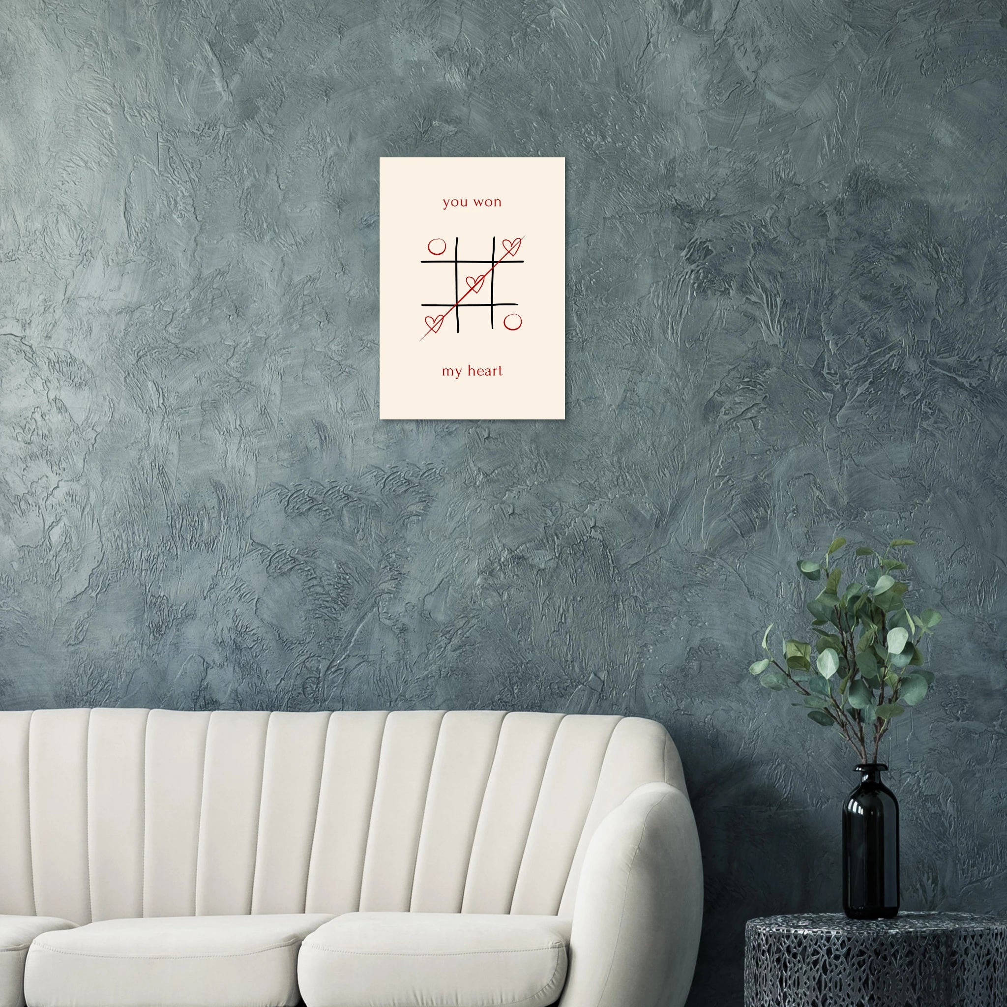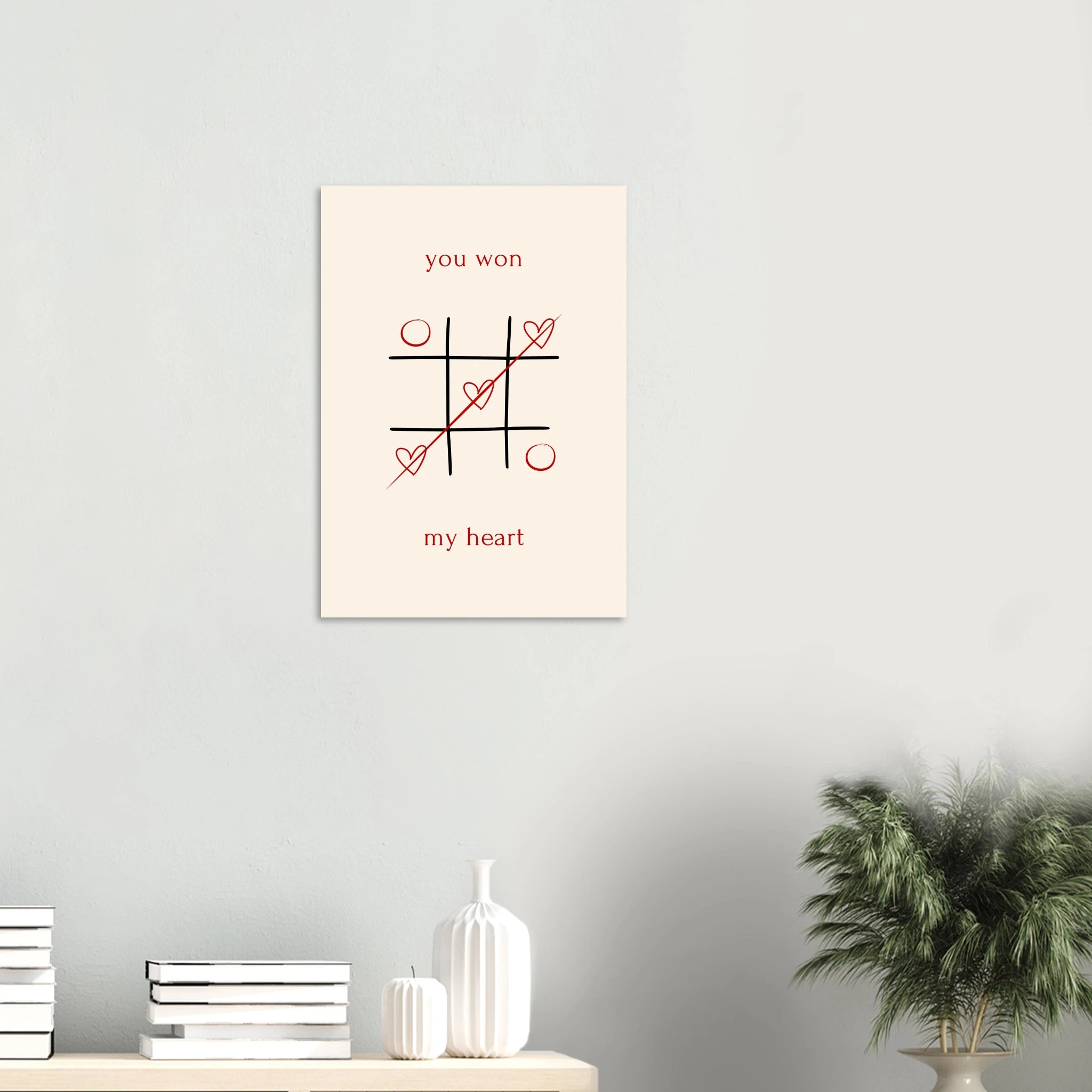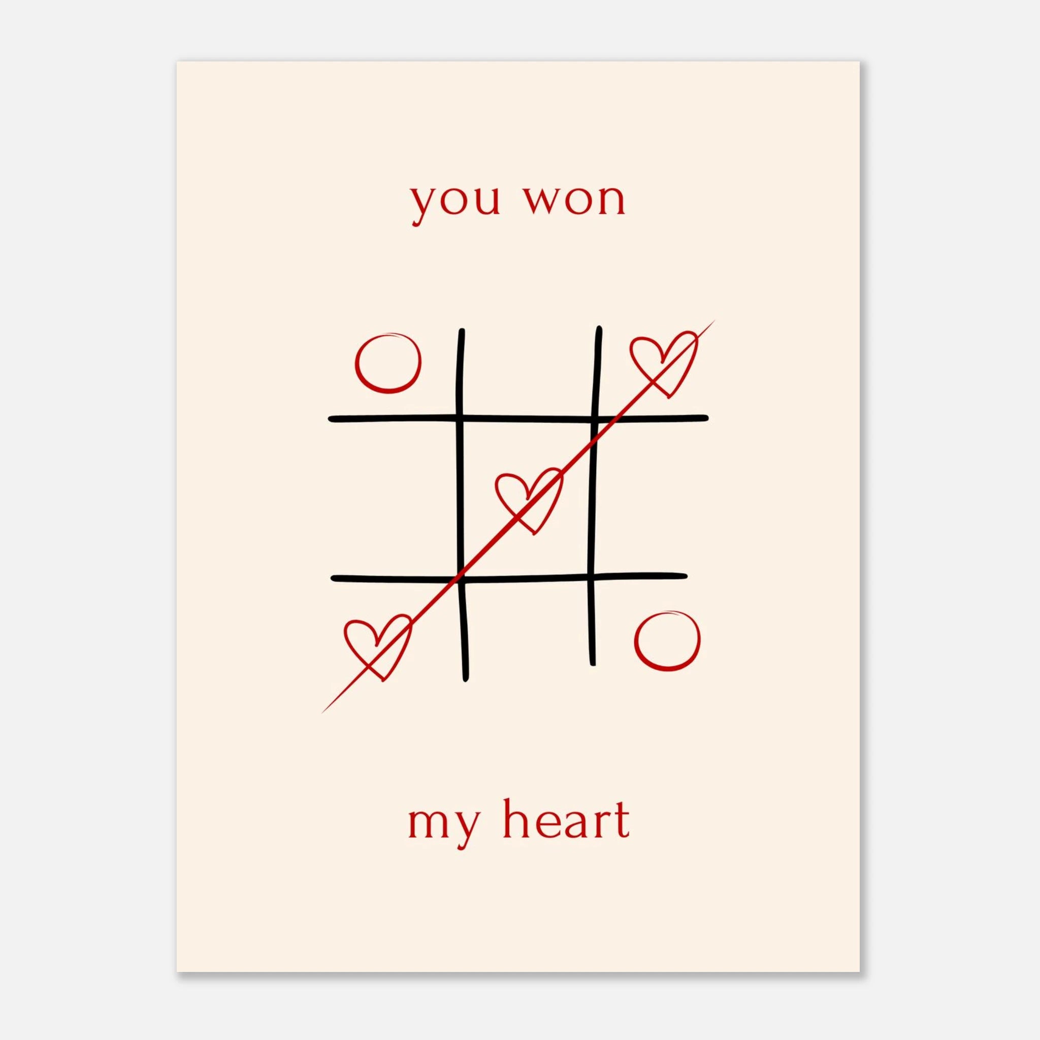 Celebrate your winning love story with our "You Won My Heart" Tic-Tac-Toe poster. This charming design, featuring classic tic-tac-toe with playful hearts and a heartfelt message, is a sweet declaration of affection. Perfect for surprising your significant other, it’s a delightful way to show them they've truly captured your heart. Printed on our premium matte paper, this poster brings a touch of romance and whimsy to any space, making it an ideal gift for anniversaries, Valentine's Day, or just because.